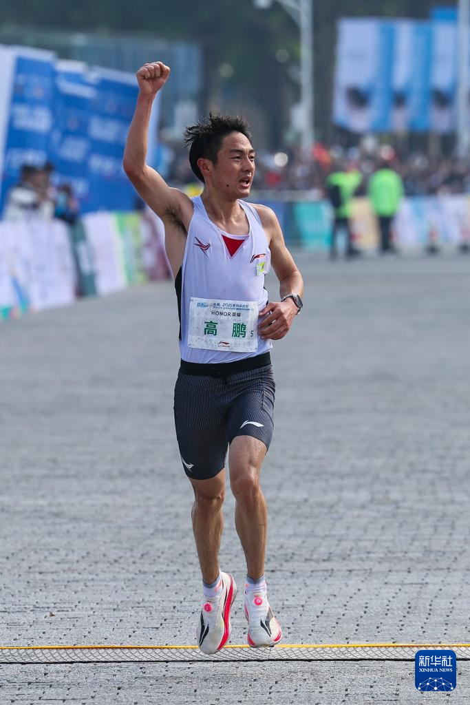 12月7日,中國(guó)選手高鵬在比賽中沖線。他以2小時(shí)13分59秒的成績(jī)獲得男子組第三名、國(guó)內(nèi)男子組第一名。
