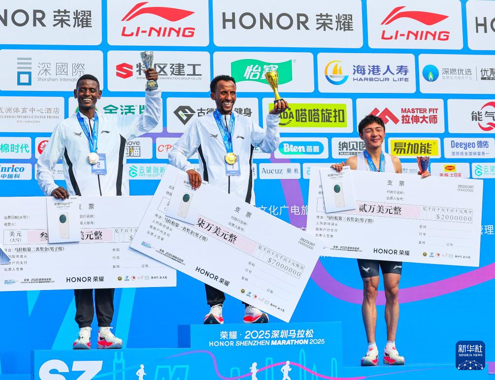 12月7日,深圳松賽男子組冠軍埃塞俄比亞選手格比(中),馬拉亞軍埃塞俄比亞選手德梅(左)和季軍中國(guó)選手高鵬在頒獎(jiǎng)儀式上合影。深圳松賽